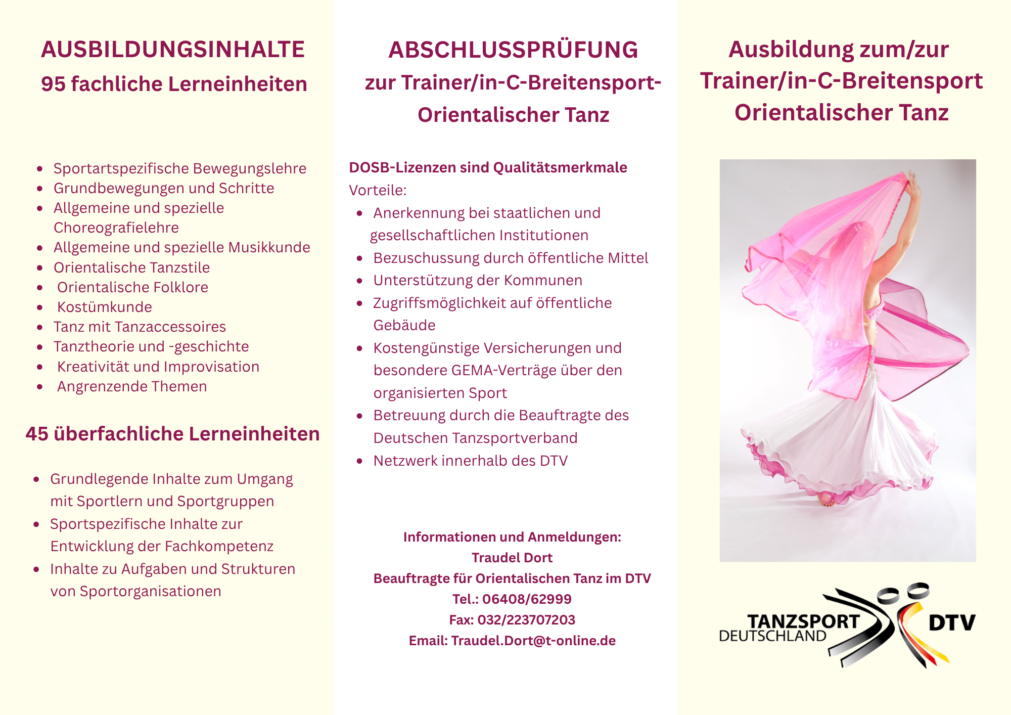 Im Januar 2026 bietet der DTV eine Neuausbildung für Trainer C Breitensport Orientalischer Tanz an. Anmeldungen sind ab sofort möglich.
